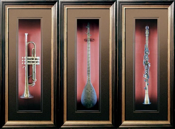 antique musical instruments in lighted boxes